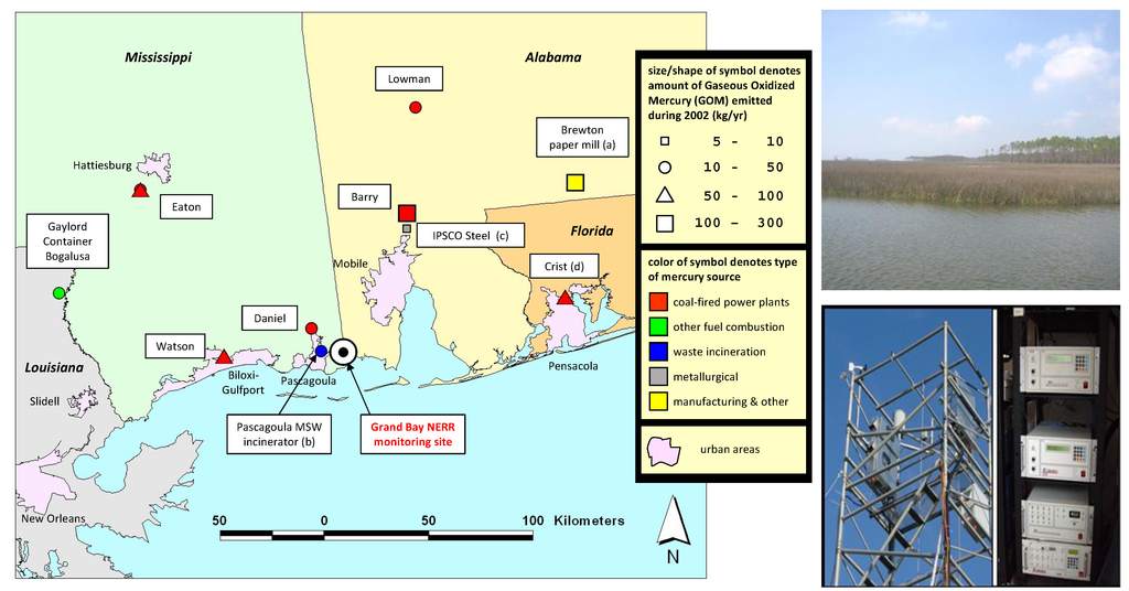 (Left) location of the Grand Bay NERR monitoring station, along with large point sources of gaseous oxidized mercury (GOM) in the region, based on the US EPA’s 2005 National Emissions Inventory (NEI). (Right top) site view from the Grand Bay NERR atmospheric mercury measurement tower. (Right bottom) the measurement tower at Grand Bay NERR, and two sets of Tekran mercury speciation units in a climate-controlled shelter adjacent to the tower.