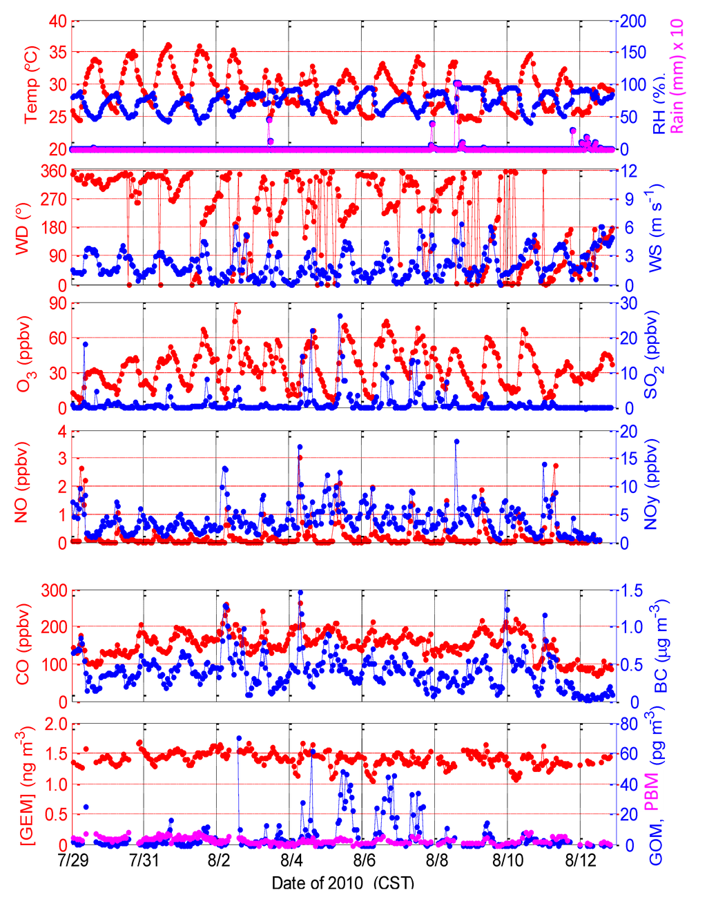 Meteorological conditions during the 2010 intensive study were intensely hot and humid but largely free of precipitation (Figure 2). In the beginning of the study period, a high-pressure system was dominant in the Gulf of Mexico. A high-pressure system with stagnant conditions can results in reactive photochemical oxidation at the site while a cold front passage can bring polluted air to the site, all of which can significantly affect the mercury observations at the site. On 2 August, as the high-pressure system relaxed a weak front was approaching the coast of Mississippi. Daytime peak temperatures ranged from 30 °C to 36 °C and nighttime minima were about 25 °C, while relative humidity ranged from 45% to 60% during mid-day and typically greater than 80%–90% overnight. Winds were commonly from northerly directions overnight and in the early morning, usually shifting to southerly-southwesterly during the day. Mid-day winds remained largely from the north from 29 July to 9 August, and were generally easterly-southeasterly toward the end of the intensive (10–12 August) as a tropical depression moved into the area, eventually passing to the south and west of the site. Wind speeds were light to moderate, with mid-day wind speeds ranging from 3 m∙s−1 to 5 m∙s−1. Precipitation events were recorded on 3 August, 7 August, 8 August, 11 August, and 12 August.