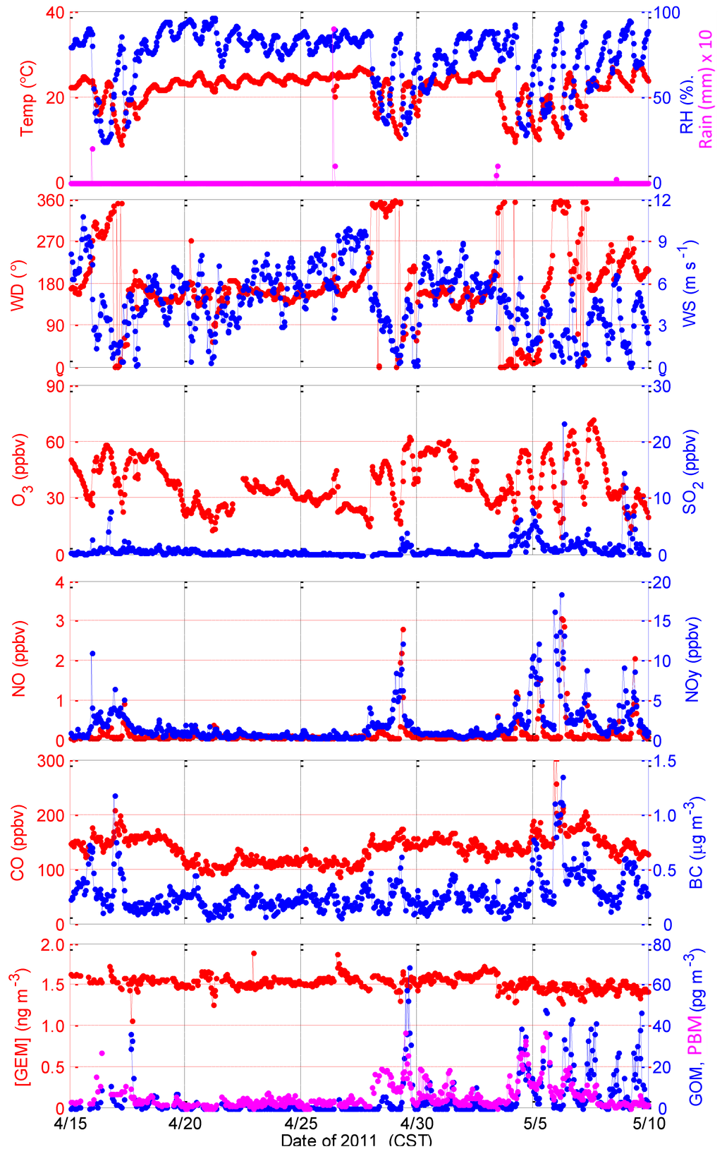 One interesting point to note is the period after 3 May when GEM dropped suddenly from ~1.6 to 1.4 ng∙m−3 and remained lower while GOM and PBM were high for the next few days. At the same time, NOy, CO, BC, SO2, and NO were also enhanced during this period. It seems that both enhanced transport of pollution and more active photochemistry were observed during this period. We note that on 3 May, the wind shifted from south to north at the same time when GEM concentration dropped and it rained for a few hours. It is most likely that an air mass change behind the cold front is responsible for the change in GEM concentration.