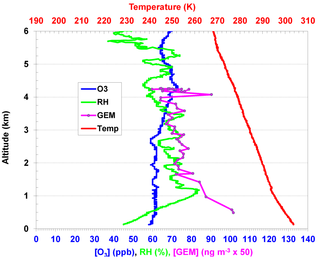 GOM was collected on KCl-coated denuders and uncoated quartz tubes, followed by thermal desorption and analysis with a Tekran Model 2537 ambient mercury vapor analyzer for the KCl-coated denuders and with a laser induced fluorescence (LIF) techniques for uncoated quartz tubes [41],. Sampling was conducted at flight altitudes ranging from the surface to 4.5 km above mean sea level (MSL). By characterizing the burden of primary and secondary trace gas and aerosol pollutants in the lower and middle troposphere, GEM and GOM measurements made from the Navajo can be interpreted.