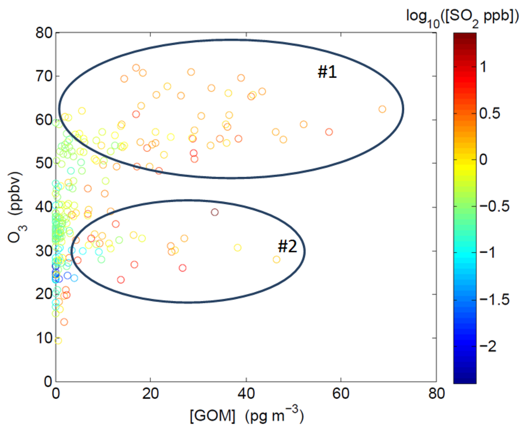 Results from the spring 2011 intensive study show that elevated GOM values during the day were usually associated with two different sets of chemical and physical conditions, as shown by two groups of data points in Figure 5. For the data points in Group #1, GOM concentrations are positively correlated with O3 in air masses associated with high O3 levels (>50 ppbv) and high solar radiation (>500 W∙m−2). Lower O3 levels (20–40 ppbv) but elevated SO2 levels (> a few ppbv) were observed for the data points in Group #2. Similar correlations between GOM and O3/SO2 have been observed in two previous studies in the Gulf of Mexico region [12,14]. This is consistent with two possible processes that could lead to elevated GOM levels: (1) photochemical conversion of GEM under conditions when ozone levels are high during the midday, and (2) direct emissions of GOM from local emission sources in which high SO2 levels were present.