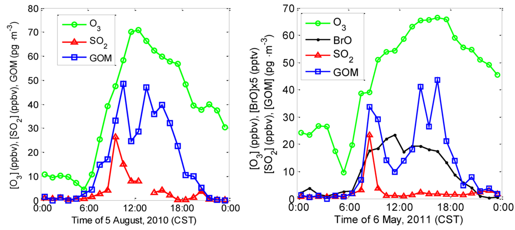 Diurnal variations of ozone, SO2, and GOM observed on 5 August 2010 (Left) and 5 May 2011 (Right).