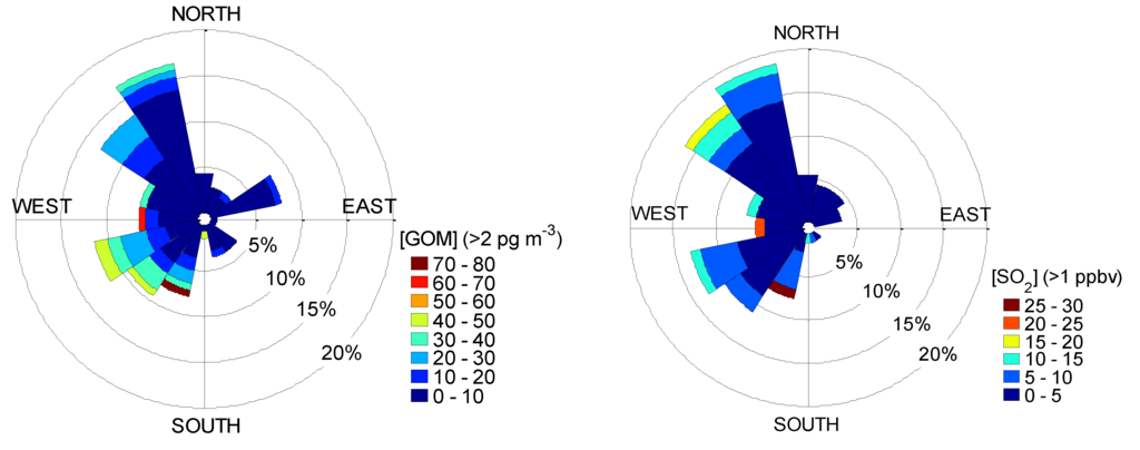Wind rose plots for GOM with [GOM] > 2 pg∙m−3 (Left) and SO2 with [SO2] > 1 ppbv (Right) during the summer 2010 campaign.