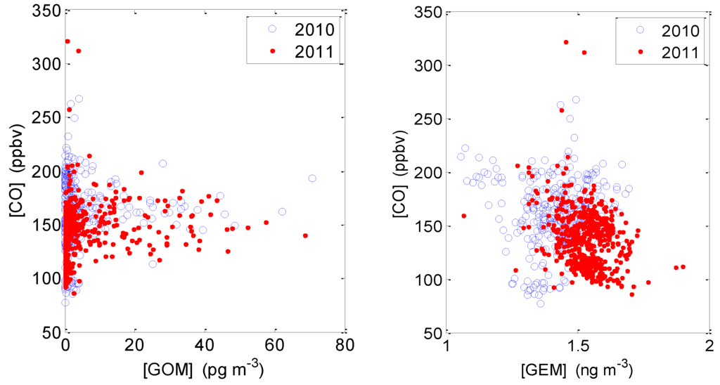 No significant correlation between CO and GEM was observed in either of the intensive studies (Figure 8), indicating that vehicle emissions are not a significant source of GEM. In addition, lower GEM concentrations were observed in summer 2010 than in spring 2011 (Figure 8). This is consistent with the seasonal GEM variation at most sites of northern mid-latitudes (e.g., [14]).