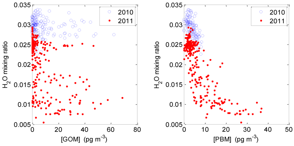 (Left) hourly averaged water volume mixing ratio versus GOM concentration during the 2010 intensive (blue circles) and the 2011 intensive (red dots). (Right) hourly averaged water volume mixing ratio versus PBM concentration during the 2010 intensive (blue circles) and the 2011 intensive (red dots). Data collected during the day with solar radiation greater than 10 W∙m−2 are plotted.