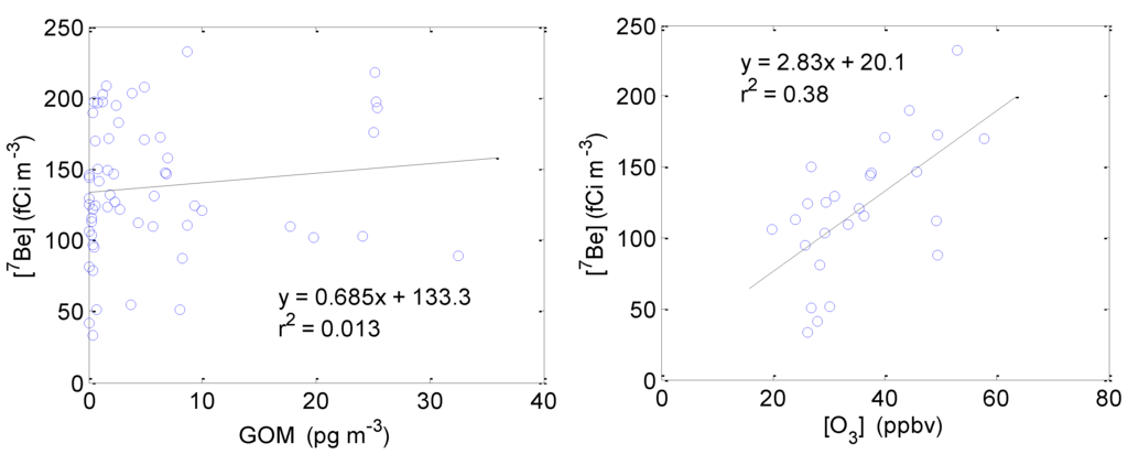 Correlation between 7Be and GOM for the entire study (Left) and between 7Be and ozone for nighttime periods when the solar radiation was less than 200 W∙m−2 (Right) during the spring 2011 intensive. Hourly GOM and ozone measurements were averaged based on the time periods when 7Be samples were collected.