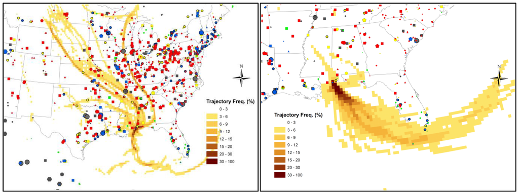 In spring 2011, trajectory frequency analysis shows that periods with [GOM] < 2 pg∙m−3 were largely associated with air masses coming from Gulf of Mexico (southeasterly), while events with [GOM] > 20 pg∙m−3 were typically associated with frequent transport passing over the areas with high mercury emissions, mainly from power plants (Figure 11). A similar signature of back trajectory frequency was observed in Hg isotopes observed during the spring 2011 intensive [26]. Trajectory frequency analysis was also conducted for the summer 2010 intensive, but no clear trends arose, possibly due to stagnant conditions and variable light winds during this study. There were only a few short periods with wind speeds greater than 5 m∙s−1 (Figure 2).