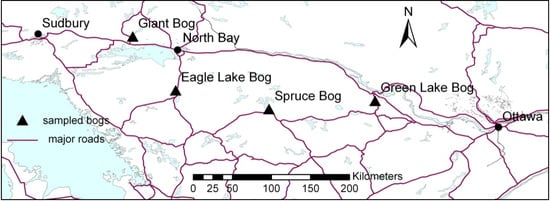 Locations of sampled peat bogs in Ontario, Canada.
