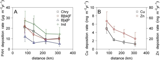 Average maximum deposition rates of (A) PAHs and (B) metals as a function of distance from the Greater Sudbury source area. The error bars represent the standard deviation of the three replicate peat cores.