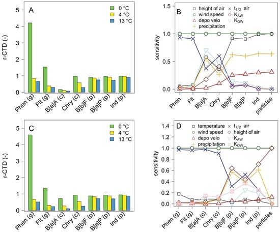 The estimated CTD of all compounds was directly proportional to wind speed (Figure 3D). The half-life of the volatile compounds in air was another highly sensitive parameter, whereas the particle-bound substances were more sensitive to precipitation and the height of the air compartment. The dry particle deposition velocity only substantially influenced the p-PAHs and particles. The sensitivity of the CTD against changes in temperature was ≤0.21 and similar regarding all compounds other than B[b]F and particles.