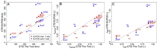 Comparison of characteristic travel distances predicted by The Tool and ELPOS for the average temperature scenario (4 °C). Results from ELPOS were obtained both with the built-in temperature correction of partition coefficients and reaction rates (ELPOS auto T-adj) and with the parameters that were temperature-adjusted manually as in The Tool (ELPOS man. T-adj). (A) Absolute CTDs; (B) CTDs relative to the particle-CTD; (C) CTDs relative to Ind. The 1:1-line is shown as dotted line.