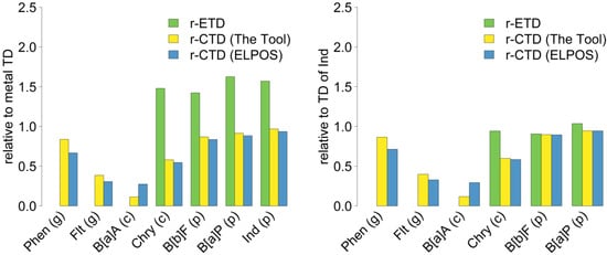 Comparison of relative ETDs and CTDs of PAHs at 4° C ((left): relative to metals (ETD) and particles (CTD); (right): relative to Ind).
