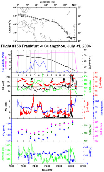 - Lai, S.C.; Baker, A.K.; Schuck, T.J.; Slemr, F.; Brenninkmeijer, C.A.M.; van Velthoven, P.; Oram, D.E.; Zahn, A.; Ziereis, H. Characterization and source regions of 51 high-CO events observed during Civil Aircraft for the Regular Investigation of the Atmosphere Based on an Instrument Container (CARIBIC) flights between south China and the Philippines, 2005–2008. J. Geophys. Res. 2011. [Google Scholar] [CrossRef]