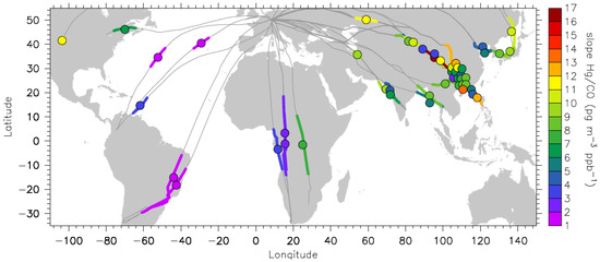 For 56 plume encounters (out of 98), the Hg vs. CO correlations were statistically significant at a confidence level of at least 95%. For these correlations, data from the same plume encountered twice in the vicinity of an airport were combined, e.g., for a plume near Guangzhou encountered during the forward and return flight to Manila (Flights 203 and 204) or a plume encountered near São Paulo during Flights 123 (Frankfurt→São Paulo), 124 (São Paulo→Santiago de Chile) and 125 (Santiago de Chile→São Paulo). Seven extremely high Hg/CO slopes of 12.9–23.7 pg∙m−3∙ppb−1 were connected with physically unrealistic negative intercepts and are thus eliminated from the data set, leaving 49 plume encounters with valid Hg/CO slopes. The geographic distribution of these plumes is shown in Figure 3.