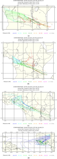 Five-day backward trajectories (every 3 min) for Flight 334 from Cape Town to Frankfurt on 21 and 22 March 2011: (a) 21–22 UTC; (b) 22–23 UTC; (c) 23–24 UTC; and (d) 0–1 UTC.