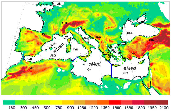 Orography of the studied area (in meters). wMed: The western Mediterranean basin consists of the Alboran (ALB), the Algerian (ALG), the Balearic (BAL), the Ligurian (LIG) and the Tyrrhenian (TYR) sub-basins; cMed: the central Mediterranean basin consists of the Adriatic Sea (ADR) and the Ionian sub-basin (ION); and eMed: the eastern Mediterranean basin consists of the Aegean Sea (AEG) and the Levantine sub-basin (LEV); BLK: Black Sea; ALP: Alps; ATL: Atlas; BAL: Balkan; PYR: Pyrenees; ANT: Anatolian and TRS: Taurus Mountains. Blue-solid lines indicate limits between western, central and eastern Mediterranean basins.