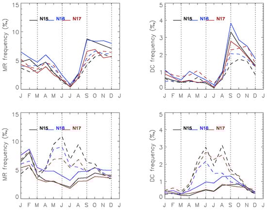 Monthly mean of (a) MR and (b) DC frequency over the Mediterranean Sea based on NOAA-15 (black), NOAA-16 (blue) and NOAA-17 (red) observations.