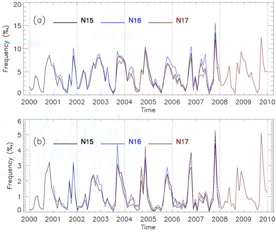 High correlation values (correlation coefficients: 0.6–0.87) between all time series of both MR and DC indicate a good agreement between the three satellites observation in term of amplitude and variabilities. Some differences are still observed; for example, NOAA-16 shows slightly higher amplitude values of MR frequency along the studied period, while NOAA-17 exhibits slightly higher amplitude values of DC frequency from 2004 onward. This difference could be related to the sampling time [].