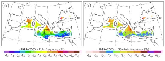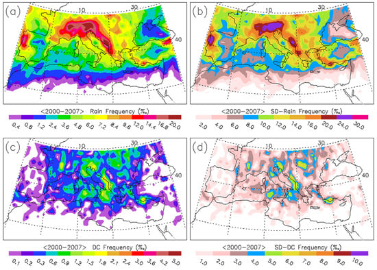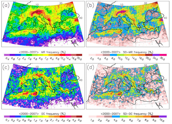 The MR and DC variability in terms of geographical distribution and amplitude are represented by the standard deviation (SD) of the monthly mean time series (96 months; 2000–2007; annual cycle included) at each grid point and shown in Figure 4b,d. SD values are relatively high compared to the mean frequency, particularly for low frequencies (compare Figure 4a with Figure 4b); this may be explained by the strong seasonal variability in the Mediterranean Sea. The most pronounced pattern is the SD values (>12‰ for MR and >6‰ for DC) over the Pyrenees, Alpines, Balkan, Carpathians and Atlas Mountains. The minimum values of the SD, below 4‰ for MR and 2‰ for DC, appear in the center of Iberian Peninsula, southeastern Alboran Sea, southeastern Mediterranean Sea and northern Africa, but they are still larger than the mean frequency there, highlighting occasional precipitation in those areas. The greatest variability in the Mediterranean Sea occurs in the southern Adriatic Sea, the northern Ionian sub-basin and around Sicily Channel, near the Balearic Islands and the Gulf of Lions, and along the Aegean coasts and the northern Levantine coasts, in good agreement with the GPCPv2 climatology variability []. These areas coincide with the spatial density distribution of intense low-pressure systems and medicanes from MEDEX (MEDiterranean EXperiment on cyclones that produce high impact weather in the Mediterranean) observations [].