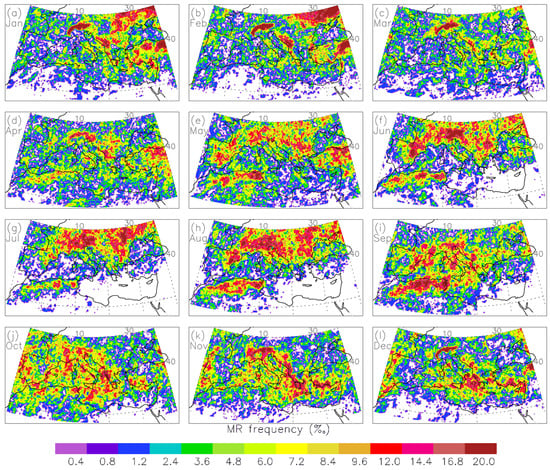 Spatial distribution of monthly climatology of MR frequency over the Mediterranean region from January 2000 throughDecember 2007 from NOAA-15 satellite.