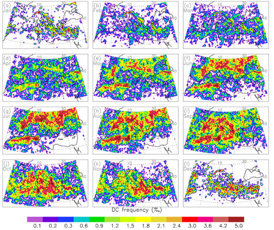 3.4. Monthly Mean Spatial Patterns of MR and DC Occurrences