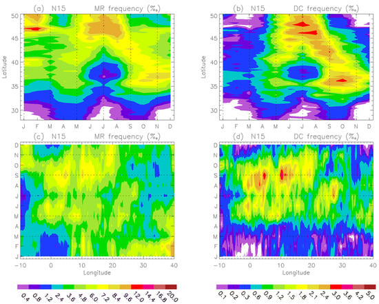Latitude time sections (a,b) and time longitude (c,d) of MR (left column) and DC (right column) frequencies over the Mediterranean region based on NOAA-15 observations, 2000–2007.