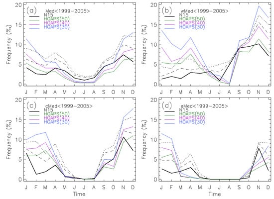 Monthly mean annual cycle averaged over the period 1999–2005 of NOAA-15 MR frequency for different thresholds of UTH (<70%, <50%, and <30%; thick-solid, dashed and dotted black, respectively), and HOAPS-3.2 rain frequency (thin-solid) for different thresholds (30, 40 and 50 mm/day; blue, purple, and green, respectively) in (a) Mediterranean Sea (Med), (b) wMed, (c) cMed and (d) eMed (see Figure 8 for the regions location).