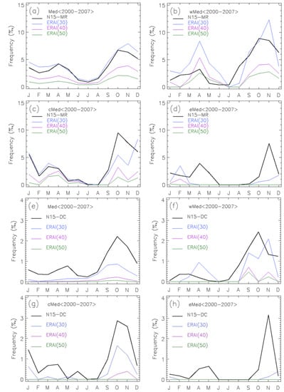 Similarly, DC from ERA-Interim is analyzed over the three regions (wMed, cMed and eMed) and is compared to DC from NOAA-15 (Figure 11f–h). Except for wMed in springtime, the annual cycle of DC frequency from NOAA-15 displays higher occurrence values than that from ERA-Interim. While the annual cycle from NOAA-15 shows almost the same behavior in the three regions, ERA-Interim annual cycle exhibits different shapes for each region. For example: in wMed, ERA-Interim displays two sharp maxima in September and November, while NOAA-15 exhibits a maximum in October only. DC frequency from NOAA-15 shows secondary peaks during March–May in the three regions, missed by ERA-Interim. Besides, DC frequency starts increasing in July (August) over wMed, in August (September) and September (October) for cMed and eMed respectively for NOAA-15 (ERA-Interim), thereby suggesting the eastward propagation of DC signal as shown above (Section 3.5).