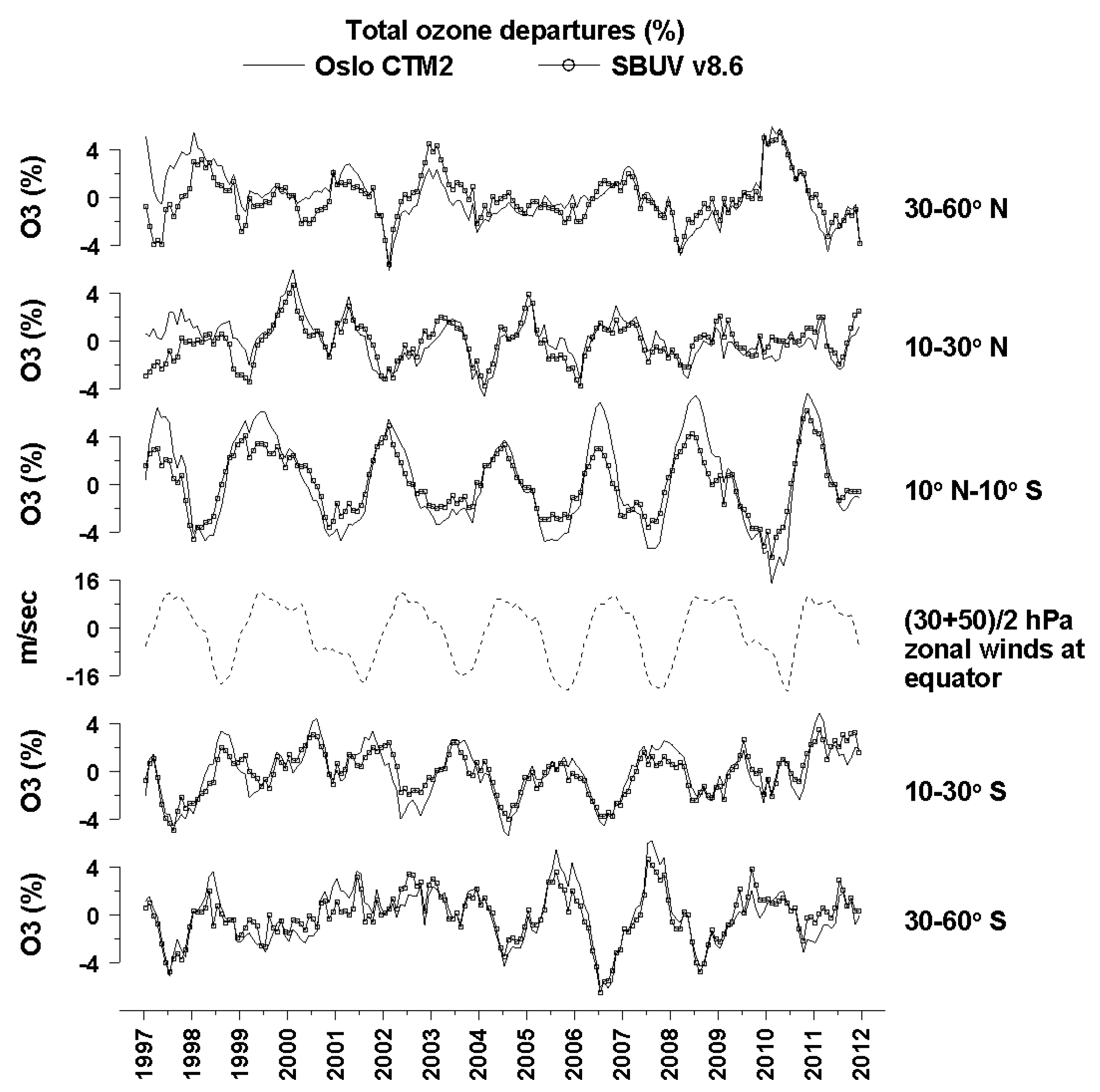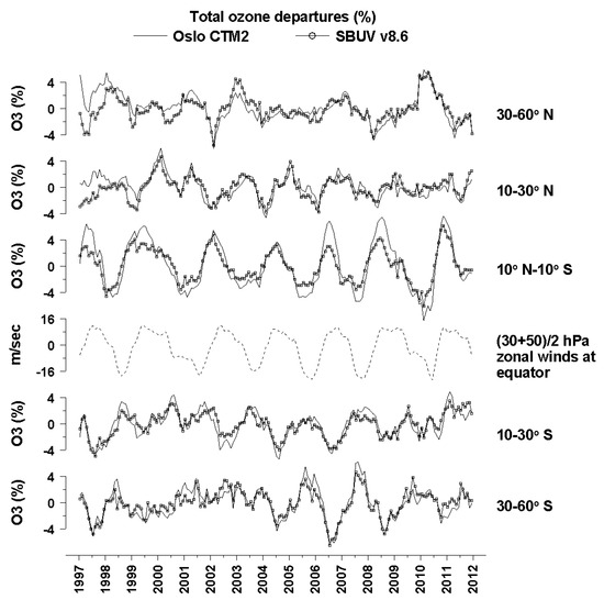 - Eleftheratos, K.; Zerefos, C.S.; Gerasopoulos, E.; Isaksen, I.S.A.; Rognerud, B.; Dalsoren, S.; Varotsos, C. A note on the comparison between total ozone from Oslo CTM2 and SBUV satellite data. Int. J. Remote Sens. 2011, 32, 2535–2545. [Google Scholar] [CrossRef]