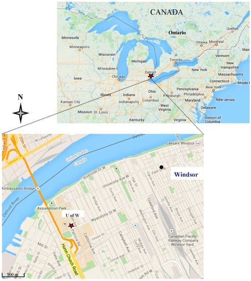 ) at the University of Windsor, Ontario, Canada. (● represents Windsor Downtown Air Quality Station. Base maps adapted from Google Maps).