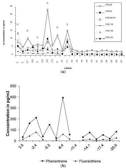 Latitudinal trends of PCB and PAH concentrations during the whole cruise transect are reported elsewhere [15,16]. Proximity to land or air mass origin influences the highest/lowest concentration of these compounds during the cruise. However, in some areas concentrations appear to be controlled by different factors. This is apparent in the most remote samples of the South Atlantic Ocean, where the lowest PCB and PAH concentrations were observed, with average Σ29PCB and Σ13PAH concentrations of 18 pg∙m−3 and 180 pg∙m−3 respectively. Here a diel cycle of PCBs and PAHs was observed (see Figure 1). Daytime concentrations in air were higher than night time levels for the more volatile PCB congeners (PCB 28, 52 and 90/101) and PAHs (fluoranthene and phenanthrene) from 3°N to 12°S and from the equator to 27°S respectively (see Tables S1 and S2). Day time concentrations were higher than night time concentrations by a factor of 2–3 for the more volatile compounds and by a factor of 1.5–2 for the less volatile compounds (see Figure 1). These observations are consistent with data from Jaward et al. [6,7] who reported a diel cycle where day time concentrations were higher than night time concentrations by a factor of 1.5–2.5 for selected PCB congeners (PCB 28 and 52) and PAHs (phenanthrene, 1-methylphenanthrene and fluoranthene) from 1°S to 32°S. In both cruises the diel PCB cycle was only observed in remote areas of the ocean from the equator to the South Atlantic. Jaward et al. [6,7] observed it along a more extended area (1°S–32°S) for both PCBs and PAHs. The datasets were obtained on different ships (RV Pelagia and RV Polarstern) and in different seasons (summer in references [6,7] and spring in this study). However, the differences in concentrations between day and night were very similar in both studies, and in both studies the diel variation was only observed for the lighter POPs and in parts of the Southern Ocean.