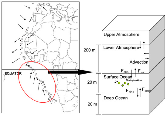 The version of the model applied in this study is a single region implementation of the Berkeley-Trent (BETR) contaminant fate modeling framework, that is described in detail elsewhere [17]. A schematic representation of the modified version of the model used in this study is presented in Figure 2. The model was parameterized to describe an atmospheric layer over two vertically segmented ocean water layers. The height of the atmosphere was set to 200 m, which is typical of the low-end of the range of mixing heights determined in the NCEP analysis and is consistent with assumptions used in calculations presented in Jaward et al. [6], and the oceanic layers were each set to 20 m depth. The mixing layer depth (MLD) data from levitus climatology (http://www.nodc.noaa.gov/OC5/pr_woa4.html) indicate that the MLD was in the range of 10–30 m in this region in this period for the year. Air-side and water-side diffusion mass transfer coefficients calculated for wind speeds observed during the cruise were used in the model. Concentrations of organic carbon in the ocean were set at 0.2 mg∙L−1, a value typical of the open ocean [29,30]. Calculations were performed considering a 100,000 km2 region around the sampling location and assuming an air residence time of 18 h, which corresponds to an average wind speed of 5 m/s. PCB 28 was selected as a test case, and a constant background inflow concentration tuned to provide modeled air concentrations consistent with those measured during this cruise and that of Jaward et al. [6,7] was used as an input function.
