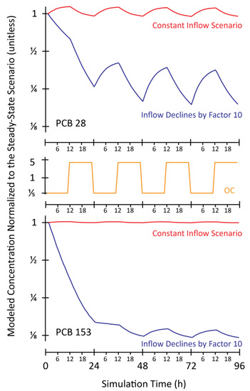 In our “constant inflow declined by factor of 10” model scenario the fugacity of PCB 28 in surface ocean water varies by a factor of 15 over a diel period, and that variability drives the factor of 2 variability in atmospheric concentrations. The model results are highly sensitive to assumptions about atmospheric dynamics and the kinetics of transfer between the atmosphere and ocean. We assumed a 200 m atmospheric mixing height, which may not be appropriate if a concentration gradient exists near the ocean surface. Under a lower “effective mixing height” assumption, lower OC variability would induce a factor of 2 variability in concentrations of PCB 28 in air. Under extreme assumptions of fast air-ocean exchange kinetics there would be near equilibrium partitioning, and variability of only a little more than a factor of 2 in the fugacity capacity of the ocean water compartment could induce a factor of 2 variability in atmospheric concentrations of either PCB 28 or PCB 153.