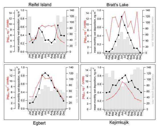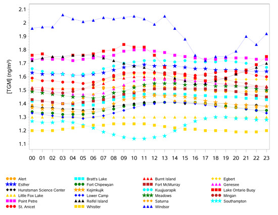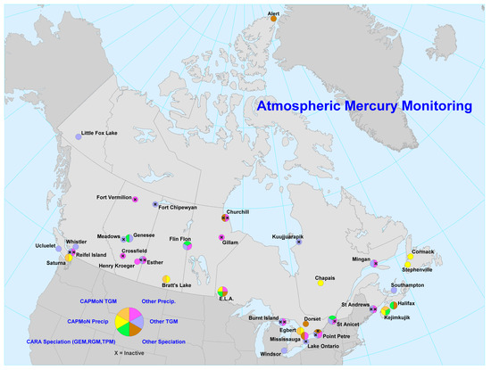Here, concentrations of Hg in the atmosphere and in precipitation are profiled across Canada. The atmospheric data are reported as TGM when measured by a Tekran 2537 instrument alone, and GEM, RGM and TPM2.5 when using the Tekran 2537/1130/1135 system. These data incorporate and update previous measurements reported for some sites [7,8,9,10,11,12,13,14,15,16,17,18,19,20,21,22] and include speciated Hg measurements at several newer sites for the first time. The data were collected and analyzed as part of a Canadian mercury science assessment [23]. Diel (Section 2.2) and seasonal (Section 2.3) patterns in atmospheric concentrations and precipitation fluxes, plus long-term trends at sites where Hg has been measured for several years (Section 2.4), are presented. Data collection and analysis methods are detailed in Section 3.