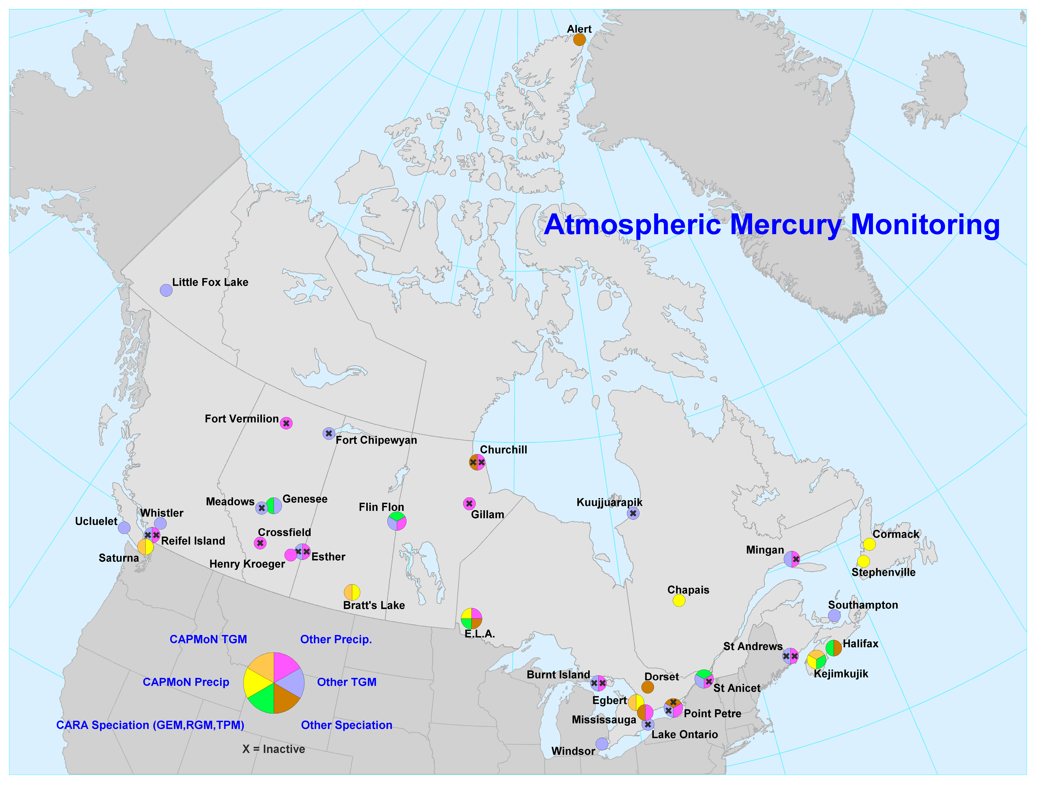 Moving forward, in addition to continued monitoring, identification of the compounds making up RGM and TPM2.5 and the development of calibration standards continue to be needed. Knowledge of these exact chemical species would also lead to improved understanding of the chemistry and wet and dry deposition rates of RGM and TPM2.5 in different air masses. Wet deposition measurements in Arctic and sub-Arctic locations would assist modellers in constraining the atmospheric Hg budget in this vast area, as would additional direct measurements of dry deposition across the country.