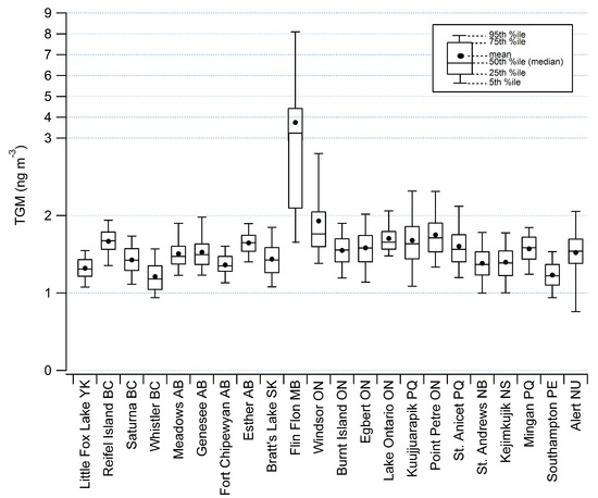 The distribution of average daily TGM concentrations at 22 measurement sites is summarized by the box and whisker plot in Figure 2. Mean TGM concentrations at all but one of the sites ranged from 1.21 to 1.93 ng∙m−3 (Table 1), within or below northern hemispheric background levels [24,25]. The bulk of TGM is GEM, with an atmospheric lifetime on the order of a year. Therefore, it is expected that TGM concentrations will be fairly uniform at background sites that are far from emission sources, except at sites where other atmospheric processes dominate [9]. The mean TGM concentration of 3.75 ng∙m−3 observed at Flin Flon, MB, is a result of local emissions [19].