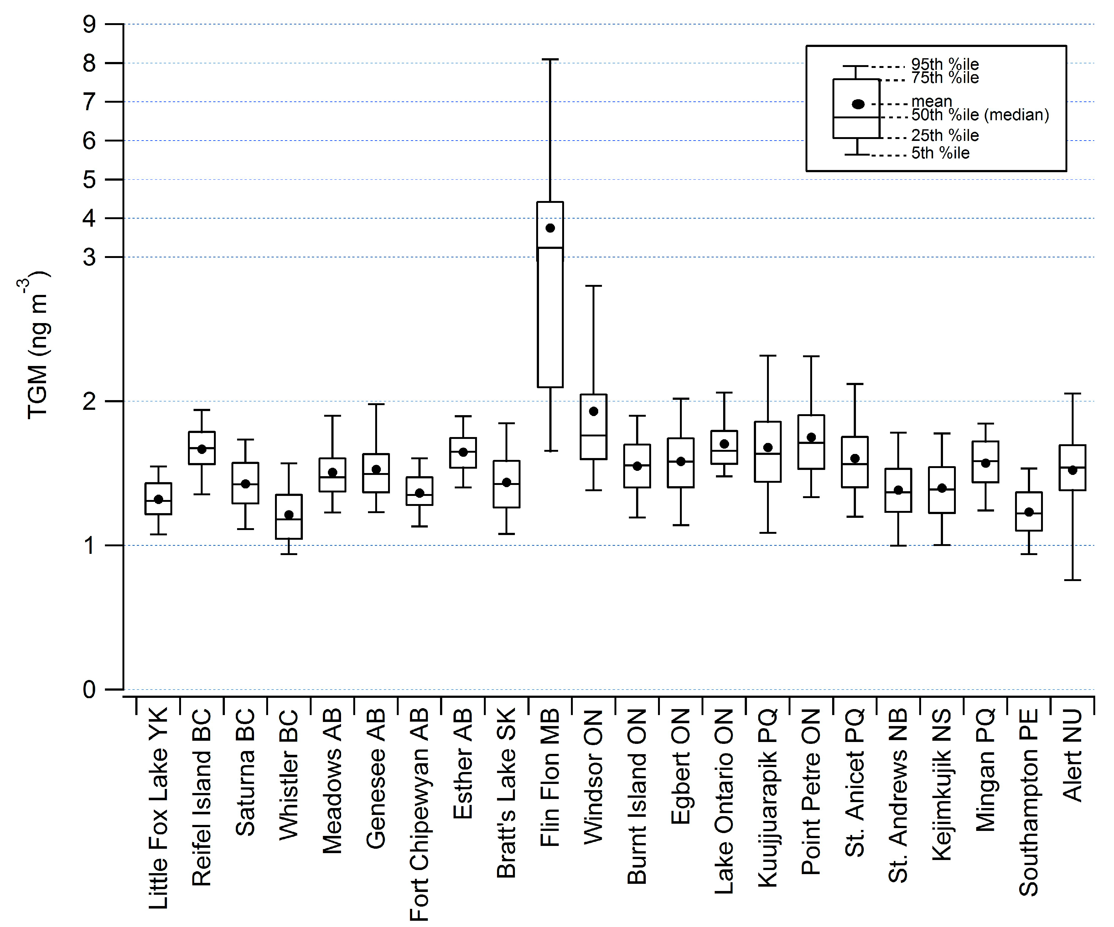 TGM concentrations, with the exception of Flin Flon, were in the range of 1.2–1.9 ng∙m−3 across the country, similar to northern hemispheric background levels. RGM and TPM2.5 ranged from a few pg∙m−3 over much of the country to hundreds of pg·m−3 during spring AMDEs at Alert and Churchill. Wet deposition amounts averaged between 0.1 and 0.8 μg∙m−2∙month−1, except at Flin Flon. Spatial patterns of Hg measurements showed the influence of local and regional sources and sinks. For example, high air concentrations of Hg species and higher Hg deposition were seen in the vicinity of the Flin Flon smelter and in the populated Great Lakes region, while AMDE chemistry in the spring and oceanic emissions in the summer influenced seasonal patterns in GEM, RGM and TPM2.5 in Arctic and sub-Arctic locations.