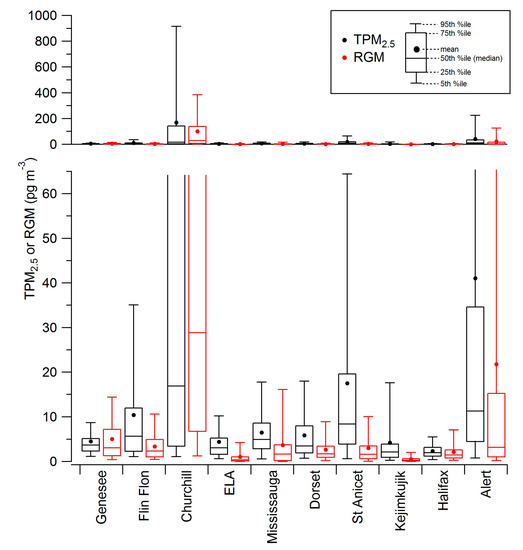 Measurements of RGM, TPM2.5 and GEM at sites measuring atmospheric Hg speciation concentrations are summarized in Table 2. A box and whisker plot of RGM and TPM2.5 is shown in Figure 3. At Alert and Churchill, the two sites bordering sea ice, RGM and TPM2.5 levels spike in the spring due to AMDEs, when GEM is oxidized to RGM periodically [27]. While the highest RGM and TPM2.5 concentrations were measured at Churchill, it should be noted that the Alert probability distribution represents data from several years and includes low RGM measurements from fall and winter. Data from Churchill were only collected for one spring and summer and therefore are more weighted by the spring months when RGM and TPM2.5 values are high. Both sites have RGM and TPM2.5 distributions highly skewed towards higher concentrations (mean >median), as expected of a site that is observing a local “source;” in this case, formation of RGM by local or regional chemistry [27,32].