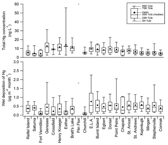 Comparison of total Hg concentrations in precipitation (top) and monthly wet deposition (bottom), with only the mean shown for Flin Flon. Time periods covered by measurements are listed in Table 3. The distributions are based on monthly volume-weighted means and monthly deposition amounts, which were first calculated from weekly samples (see Experimental).
