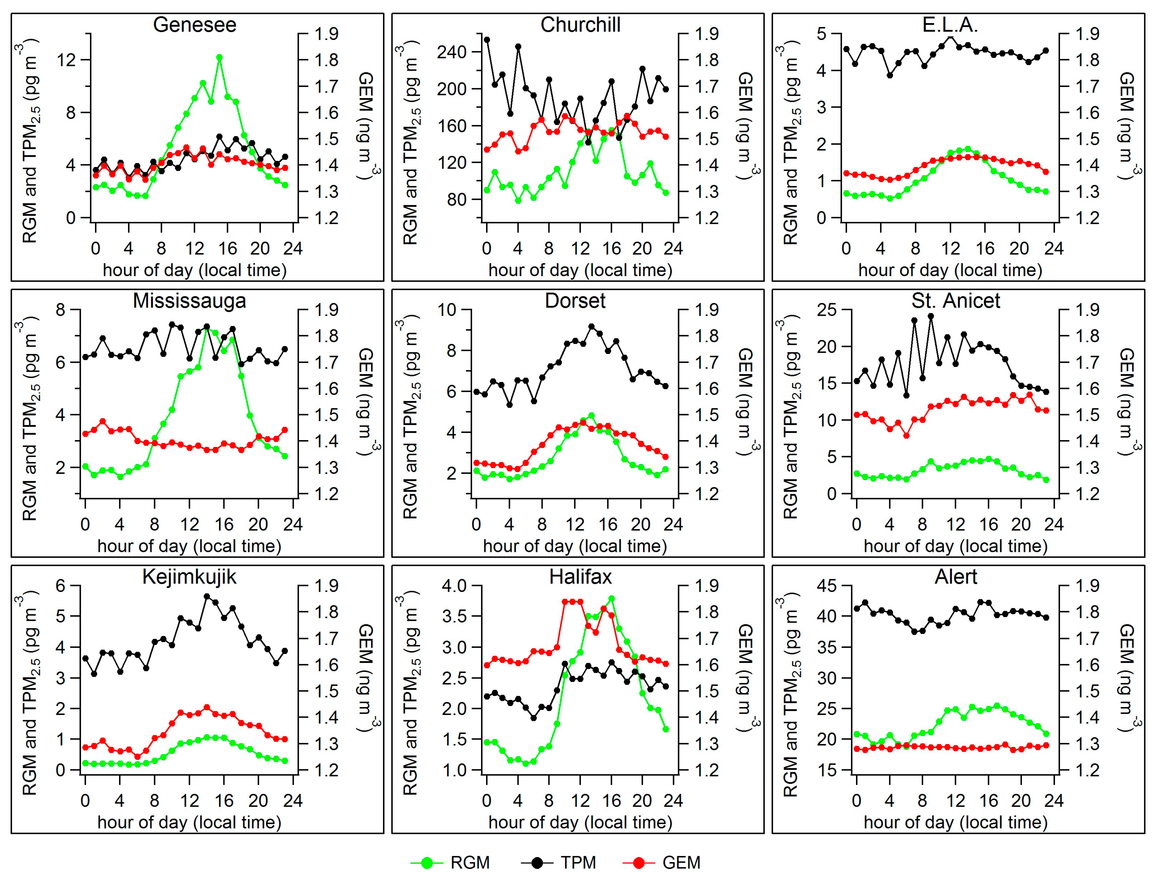 Diel patterns of RGM, TPM2.5 and GEM were also investigated for 10 different sites. These profiles are shown for every site except Flin Flon in Figure 6. RGM concentrations at all sites peaked in the afternoon, with amplitudes of 35%–180% of the mean. This suggests that short-lived RGM is formed through photo-oxidation of GEM in the atmosphere [44]. An afternoon maximum may also be due to higher RGM concentrations in the free troposphere (e.g., [45,46]) that mix down to the surface during the day. Higher concentrations aloft could arise from the slower nighttime dry deposition above the nocturnal boundary layer. These two mechanisms—in situ photo-oxidation and mixing with higher RGM levels above—could explain the consistent diel pattern across North American sites [39,40,42,43]. At certain sites, such as Genesee, local emission sources that release RGM above the nocturnal boundary layer, such that these releases are not mixed into the surface air until daytime [47], could contribute to the observed pattern as well.