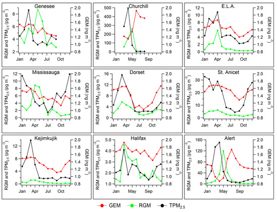 Overall, TGM concentrations and distributions at these Canadian sites are similar to previously reported data [8,9] where available, with small decreases at some sites observed over the long term (discussed further in Section 2.4). The sites with the lowest TGM levels, ranging from 1.21–1.38 ng∙m−3, include two high-elevation sites near the west coast (Whistler and Little Fox Lake) and three maritime sites at Southampton, Kejimkujik and St. Andrews. While the latter two sites began measurements in the 1990s, the other three cover more recent periods and the lower concentrations may be partially due to decreases in TGM since the 1990s [25,26]. The highest TGM levels by far were observed at Flin Flon, due to local emissions from the copper smelter which was the largest point source of Hg in Canada before closure [19]. The sites that show the most variable TGM concentrations include Alert and Kuujjuarapik, which both experience episodes of rapid conversion of GEM to RGM and/or TPM2.5 in the spring, known as atmospheric mercury depletion events (AMDEs) [27]. These AMDEs, as well as emissions from the snow and ocean in late spring and summer [28,29,30,31], lead to frequent and large fluctuations in TGM. Sites that were affected by local and regional pollution such as Windsor, Point Petre, Flin Flon and St. Anicet showed right-skewed distributions (i.e., a long tail of higher concentrations) that were due to periodic episodes of high TGM concentrations. Similarly, the concentration data from the Lake Ontario Buoy, which is downwind of U.S. emission sources, and the Edmonton-area sites at Genesee and Meadows, which are downwind of local coal-fired power plants, also showed right-skewed distributions. TGM at Kuujjuarapik has a right-skewed distribution that is likely a result of the increased GEM concentrations in the spring and summer following the AMDE season. In contrast, TGM concentrations at Alert are left-skewed due to the periodic losses of GEM during AMDEs that have a greater effect on TGM levels in comparison to emissions. These seasonal cycles are discussed in more detail in Section 2.3.