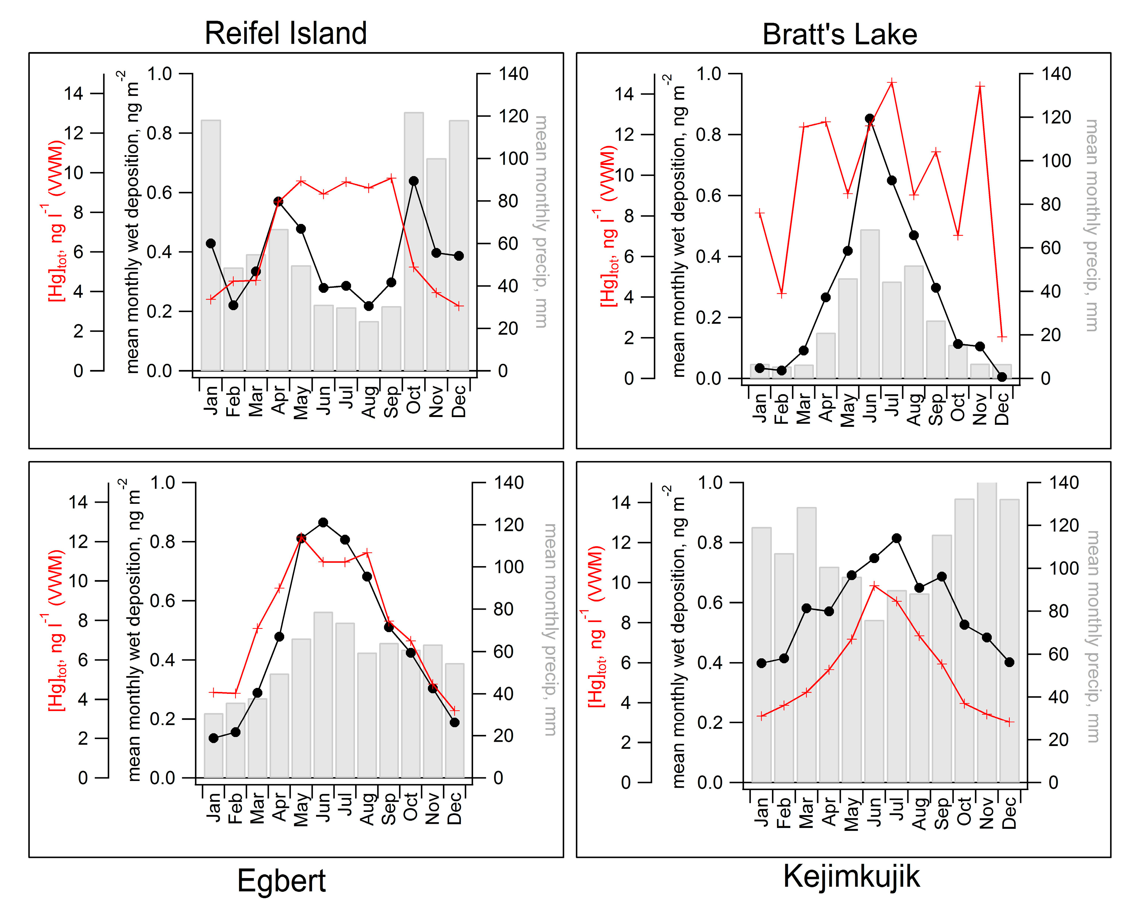 Seasonal patterns in TGM and GEM concentrations were similar at most mid-latitude sites, with maxima in the late winter or early spring and minima in the fall, perhaps due to surface evasion. Sites influenced by AMDEs were the exception, with highest concentrations in the summer and lower in the spring (Alert) or winter (Kuujjuarapik). RGM levels peaked in the spring, in contrast to the summer maximum that might be expected due to its photochemical source. Increased wet and dry deposition, or analytical issues, may play a role. TPM2.5 levels were also highest in spring at remote sites and in winter at more polluted locations. Wet deposition of total Hg was almost always highest in summer, except at Reifel Island, BC, where the dry summer months resulted in much lower wet deposition.