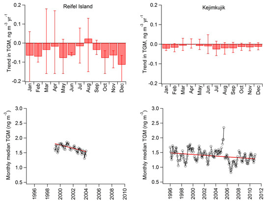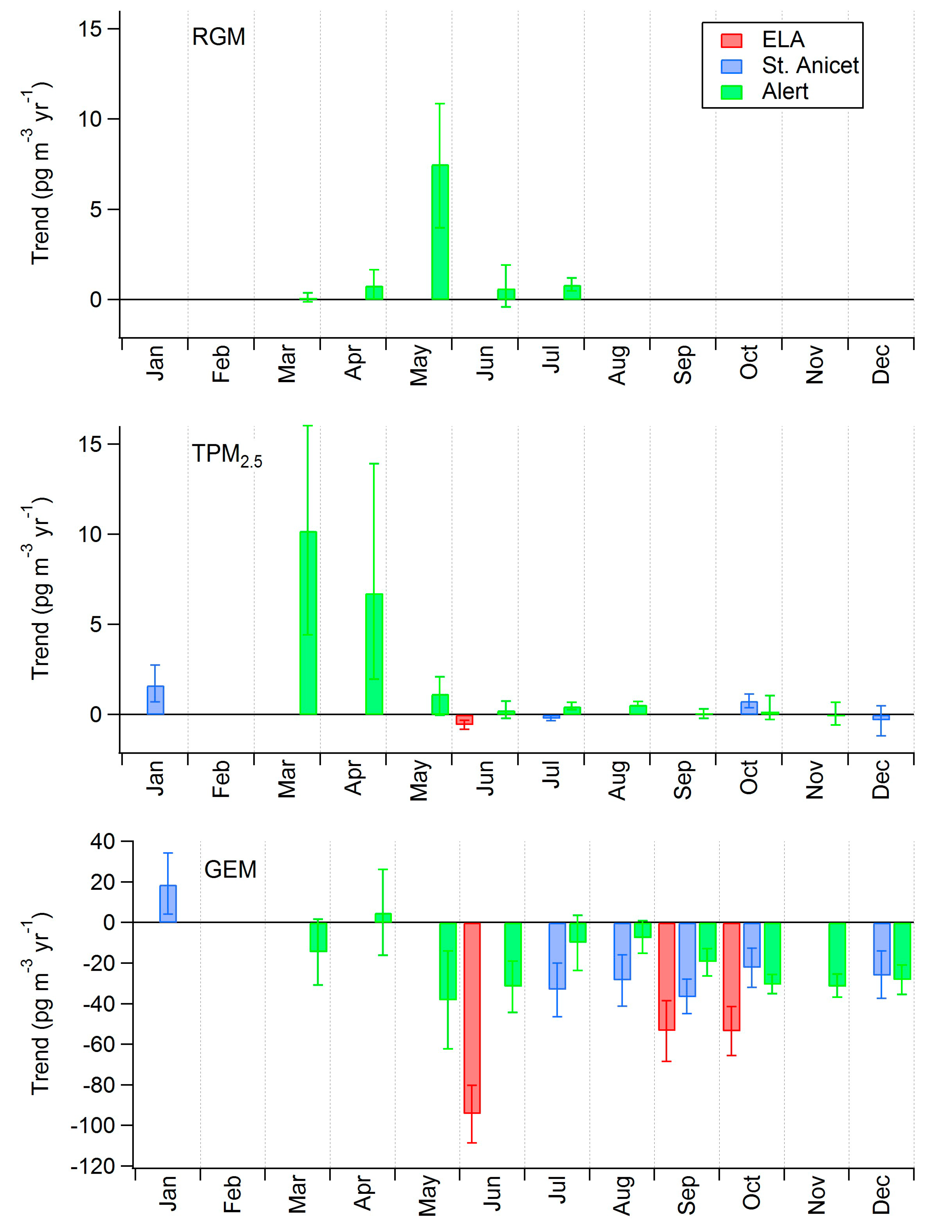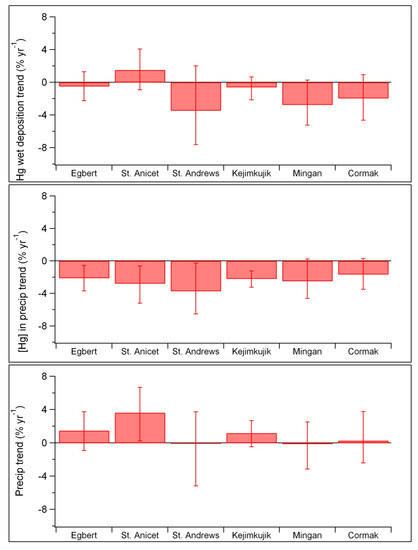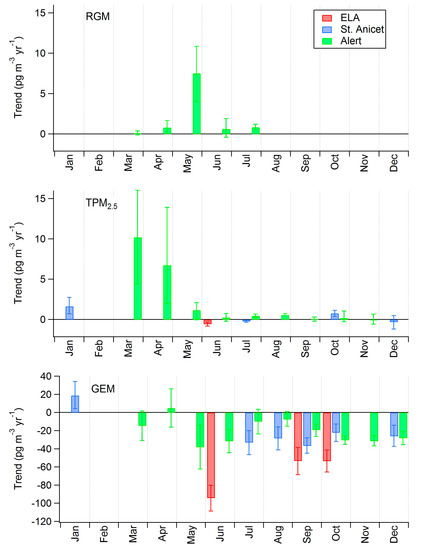 Concentrations of both TGM and Hg in precipitation have declined at most sites since the mid-1990s, while Hg wet deposition trends were not significant due to variability in precipitation amounts. The TGM trends extend the number of global sites reporting decreases over the last two decades [7,25,26,63]. Increases in springtime RGM and TPM2.5 previously noted at Alert for 2002–2009 [26] are further supported by the additional two years of data included here.