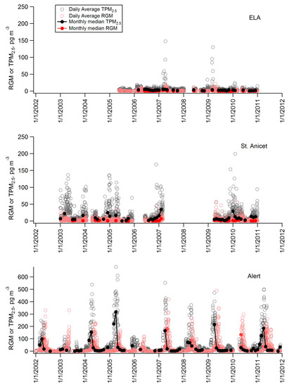 RGM is relatively short-lived with respect to deposition to particles or surfaces, with an estimated lifetime of a few hours to days [5]. Therefore, remote sites that are far from emission sources and are not affected by AMDEs, such as the ELA and Kejimkujik, report very low concentration levels of RGM. In fact, the RGM concentration at these locations were below the manufacturer’s suggested detection limit of ~2 pg∙m−3 more than 75% of the time. Further, even some sites that would be expected to be affected by local emission sources (such as Mississauga, St. Anicet and Halifax) have median RGM levels below this detection limit (Figure 3), though method detection limits determined by blank measurements at individual sites may be lower (see Experimental section). Genesee and Flin Flon sites had higher RGM concentrations due to local sources of Hg pollution (coal-fired power plants [17] and a copper smelter [19], respectively) but concentrations were not as high as those reported in the Arctic at Alert and Churchill. Concentrations of TPM2.5 were usually, but not always, higher than RGM (Table 2; Figure 3) such that median values were above the 2 pg·m−3 threshold at most sites. Similar to RGM, mid-latitude sites had lower TPM2.5 concentrations than the northern coastal sites, Alert and Churchill. Concentrations of RGM and TPM2.5 at mid-latitude sites were comparable to those reported by Gay et al. [18] for remote sites across the United States, plus Kejimkujik, for 2009–2011.