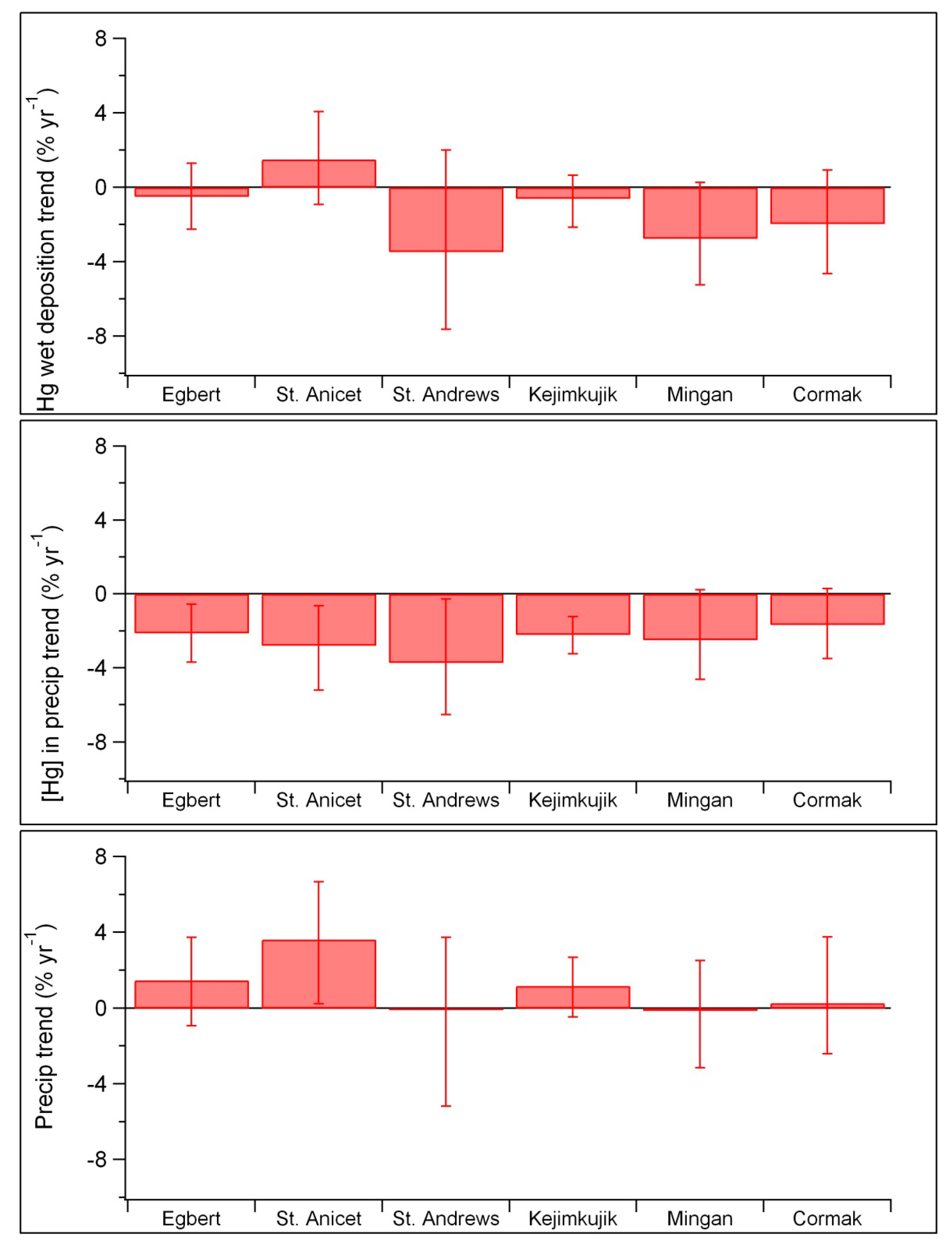 Amanda S. Cole created several figures and wrote the majority of the text, along with Alexandra Steffen. Julie Narayan generated statistics for a large part of the data as well as additional figures. Chris S. Eckley assembled and quality controlled several data sets and wrote parts of the experimental section. Rob Tordon collected data from St. Andrews, Kejimkujik, Cormak and Halifax and contributed to writing the experimental section. Data were collected and editorial input provided by Martin Pilote (St. Anicet, Mingan and Kuujjuarapik), Jennifer A. Graydon and Vincent L. St. Louis (ELA), Xiaohong Xu (Windsor) and Brian A. Branfireun (Mississauga and Dorset).