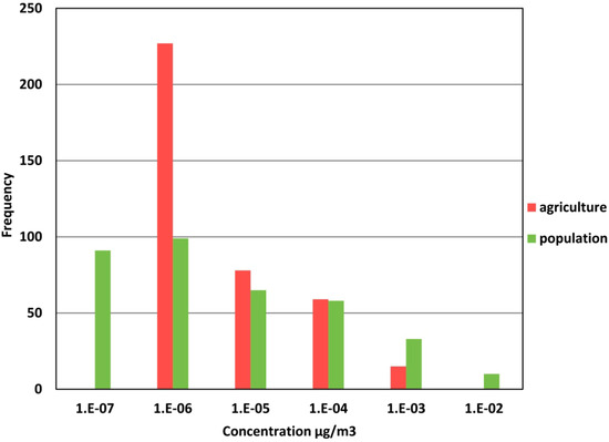 Histogram of γ-HCH concentration (µg/m3) computed with Equation (5) for the year 1995 with the distribution of emissions according to agriculture or to population density.