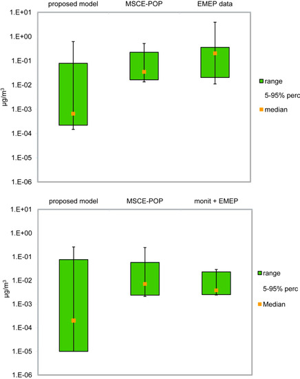 In Figure 3, we compare predicted concentrations with monitored values for the years 1995 and 2005; although the upper extremes tend to be fairly similar, concentrations predicted with Equation (5) are apparently lower than observations in both years. The same figure shows also the range of concentrations predicted through the MSCE-POP model, chosen as a benchmark. In this case, concentrations are correctly predicted in the whole range, supporting the reliability of this model as a reference to evaluate spatial distributions obtained from Equation (5).