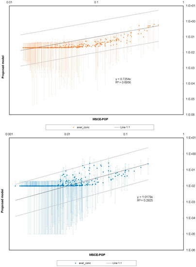 Figure 5 shows how adding the background of 20 pg/m3 for 1995 and 10 pg/m3 for 2005 to concentrations predicted with Equation (5) allows bringing the predictions to the same range of observed concentrations, consistently with the MSCE-POP model. These background concentrations are about half an order of magnitude lower than those used by other authors [49] in the computation of lindane concentrations at the European scale.