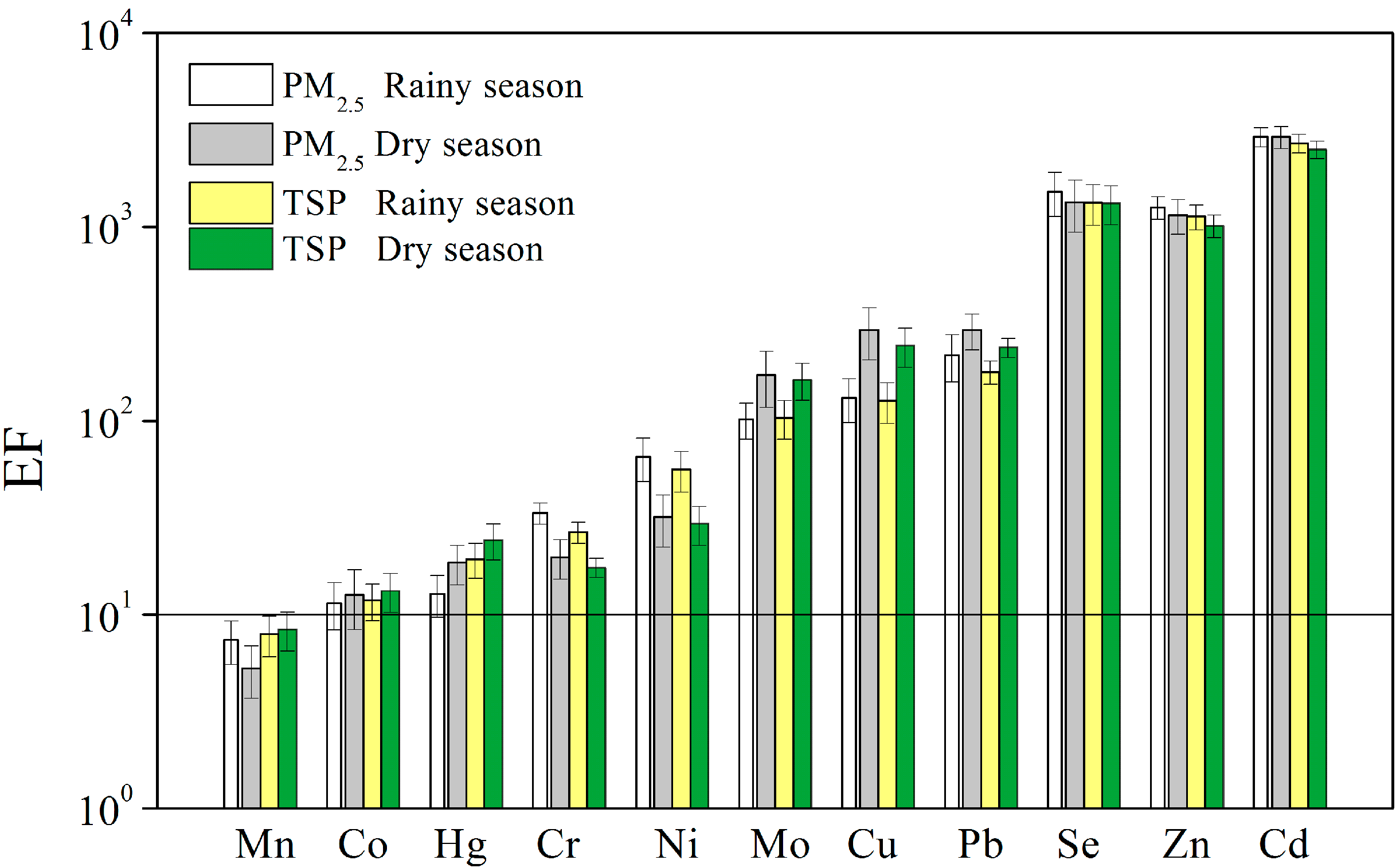 Enrichment factors of the metals in PM2.5 and TSP sampled in dry and rainy seasons. The ANOVA test showed there were no significant differences between the seasons.