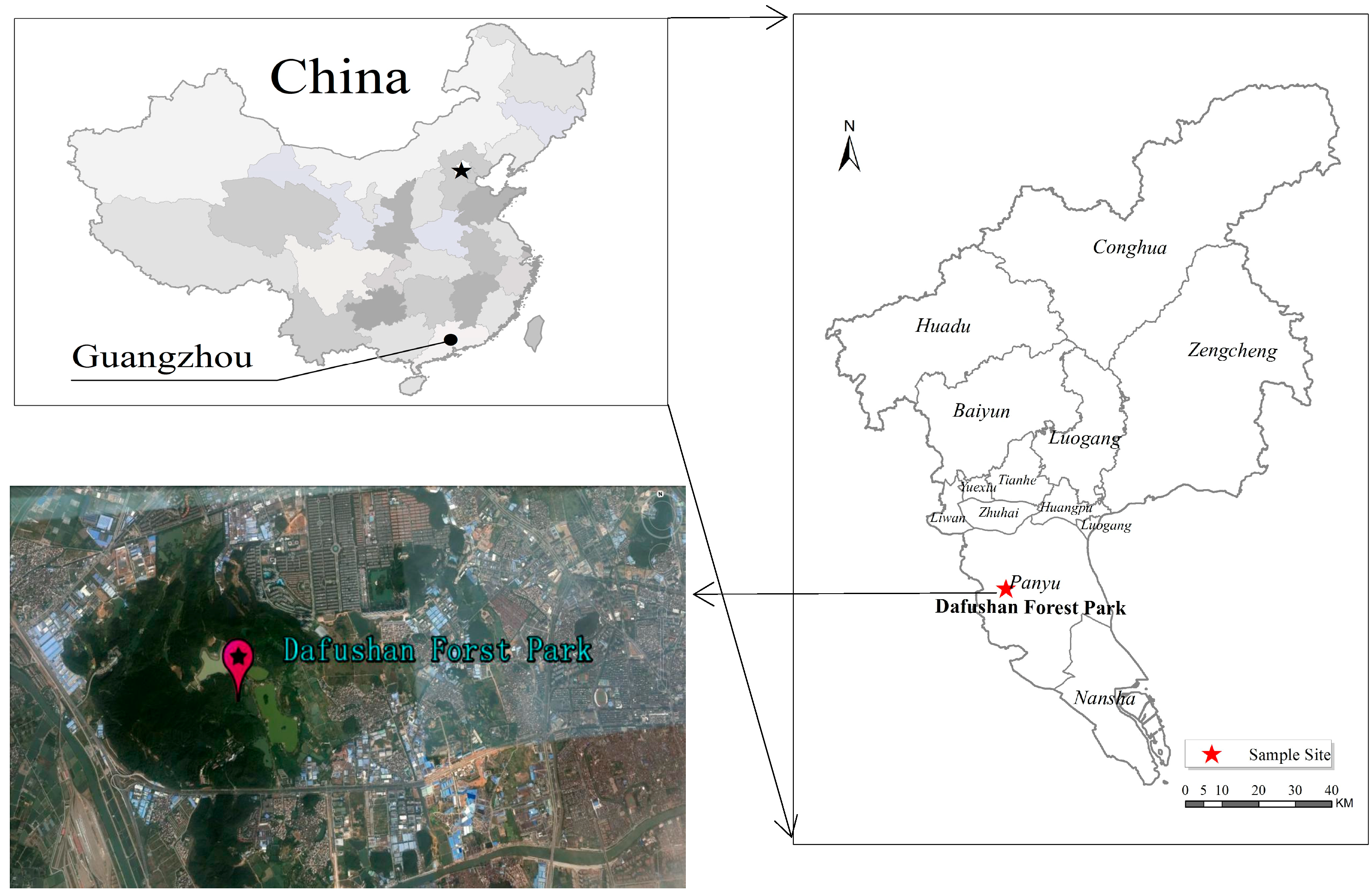 Dafushan urban forest park is located in southern Guangzhou, Guangdong province (22°57′N–22°58′N, 113°17′E–113°18.8′E) (Figure 2) and was one of the venues for the 2010 Asian games. The park contains approximately 600 hm2 of forest vegetation and attracts more than one million visitors annually. Guangzhou is characterized by a subtropical climate with a mean annual rainfall of 1700 mm distributed seasonally, with approximately 80% falling in the rainy season (from April to September) and approximately 20% in the dry season (from October to March). The meteorological data for Dafushan forest park were listed in Table 4 [26]. In the rainy season, the prevailing wind from the south brings clean air from the Pacific Ocean and South China Ocean, while in the dry season, the prevailing wind from the north brings air from the inland area of China. There are no high buildings, factories or point-sources of contamination in this park; however, there are municipal traffic, residential and commercial activities around the park.